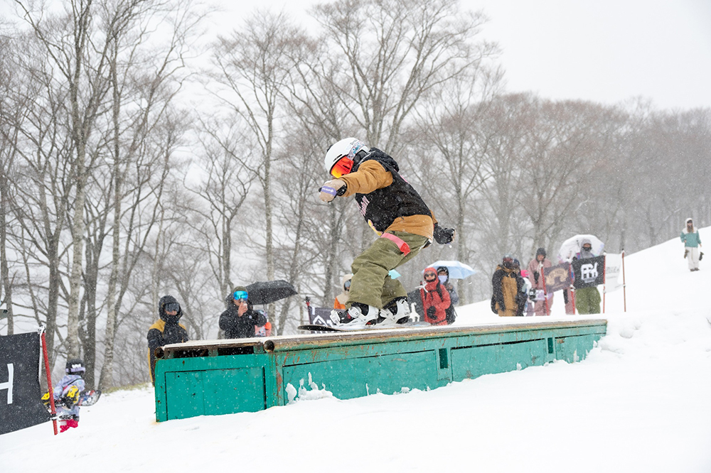 そして、オープンクラスは今年もヤバかった!降りしきる雪の中でも積極的に攻める!ベーシックな技にはしっかりスタイルを入れて、バックリップや270アウト、スイッチトリックなど難易度の高い技のオンパレード。今回は1ヒットということもあり、ルーキークラスからオープンクラスに上がった女のコたちも含めて、みんなかなり攻めた滑りで予選から熱い戦いが繰り広げられました!