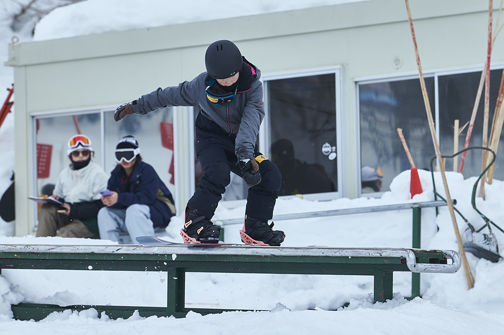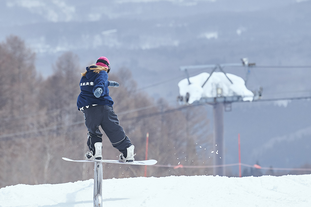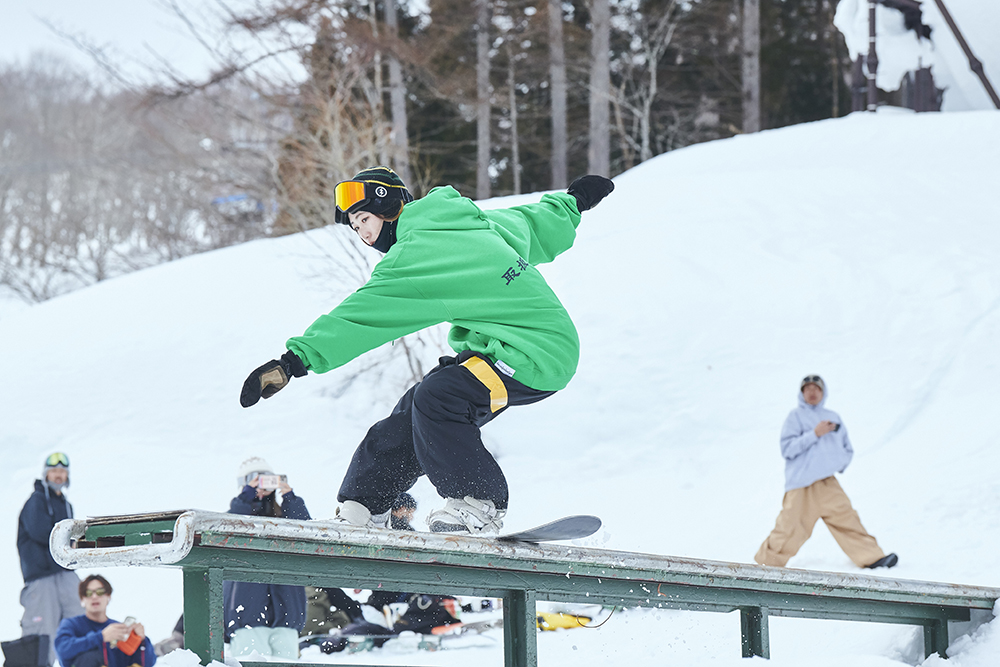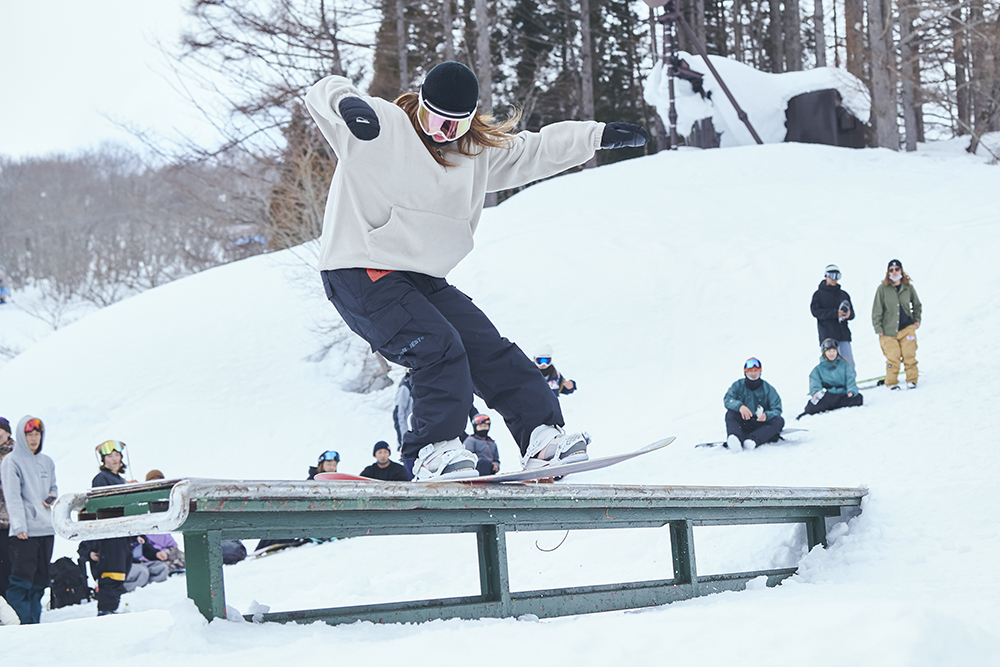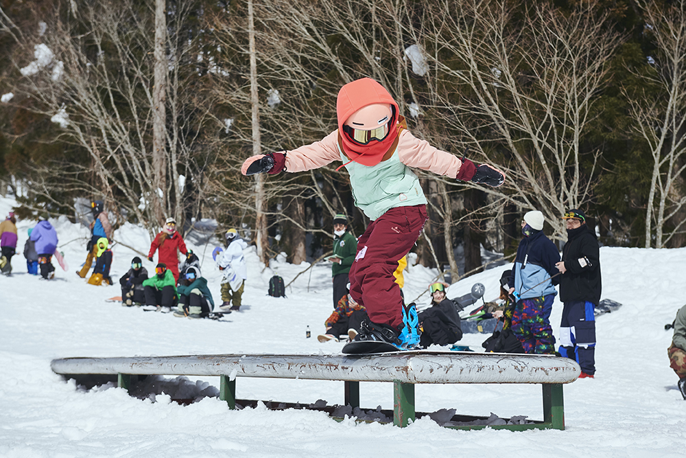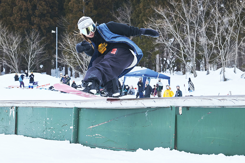 「去年初めて大奥に参加しました。順位を決めるイベントに出ること自体が初めてですごく緊張しましたが、イケてる女子たちの滑りを見て『自分はまだまだだ』と、いい意味で刺激をもらえました。イベントに参加するとモチベーションがかなり上がります。特に大奥は関西や中部、関東からもイケてる女子が集結するので刺激になります!ルーキークラスはレールも選択肢にあったのですが怖くて攻めれず。それが少し心残りですが、カッコいい女子の滑りを見れて、新しい出会いもあったので参加して良かったです。