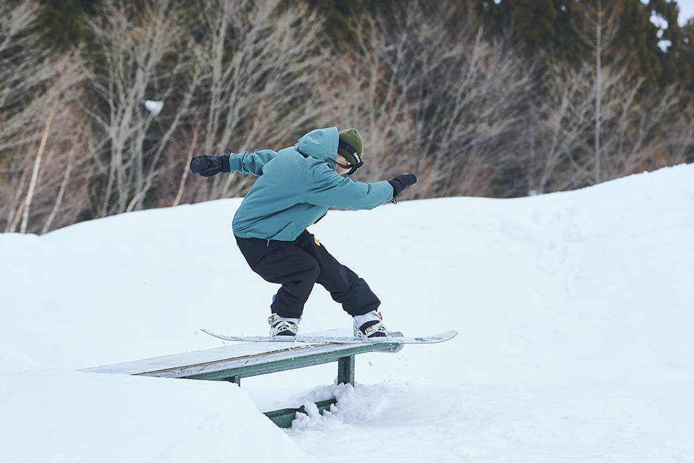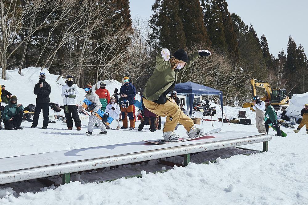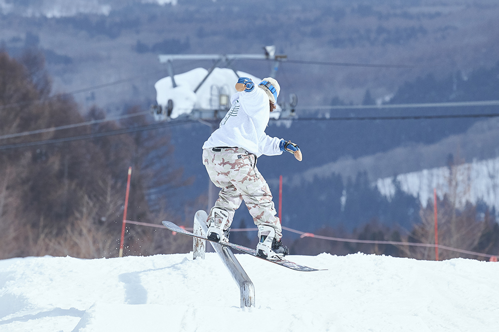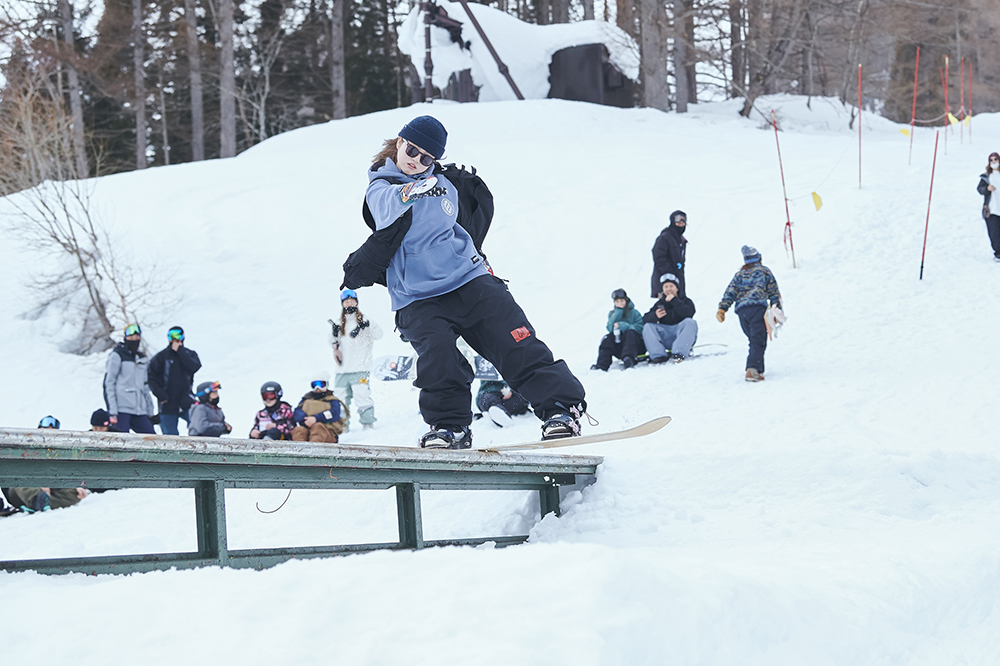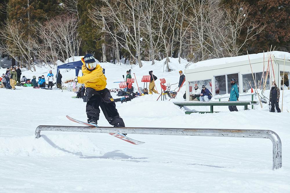 「先週から竜王に篭り始めて、この大奥は会場が住んでいるところと近かったので参加させていただきました。会社を辞めて、アラサーにして初篭りです(笑)。スノーボードはかれこれ5年くらいやっていて、ジブだけじゃなくて何でもやります。カービングもそこそこやりますし、パウダーも楽しいです。大会は、この前の岐阜県にあるダイナランドで開催されたスロープスタイルに出て、今回で2回目です。大奥は和気藹々としていたので、そこまで緊張感もなく滑れました。最初の時はめっちゃ緊張していたので、少しは慣れたのかな?」
