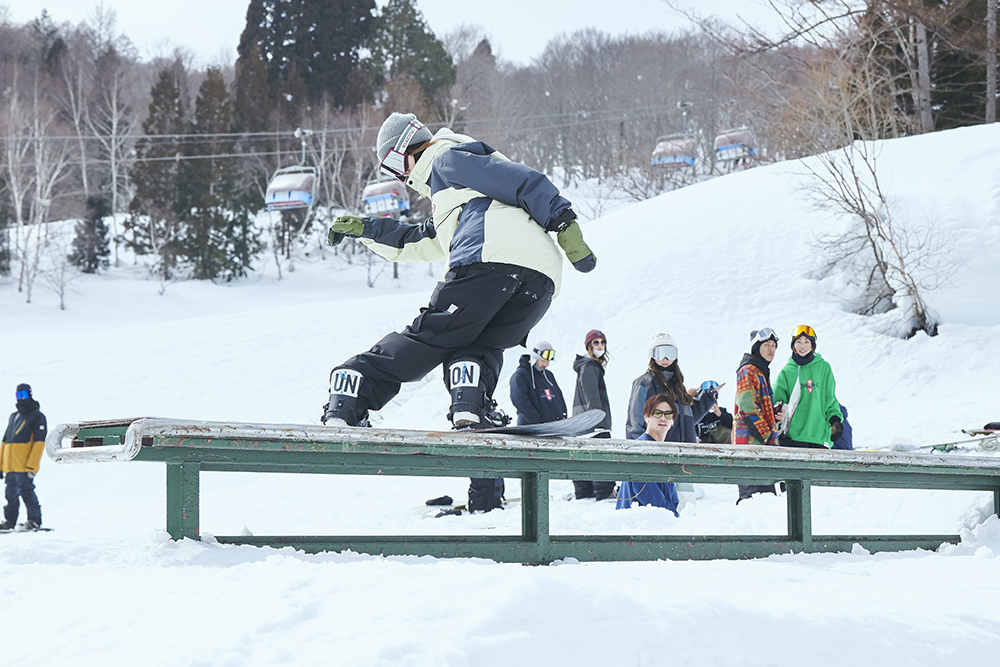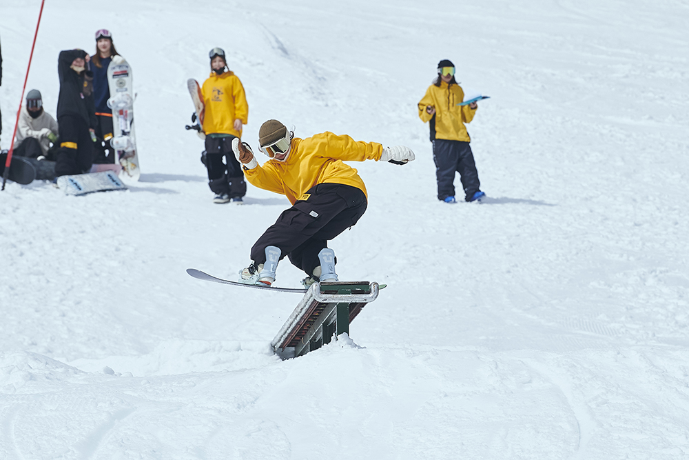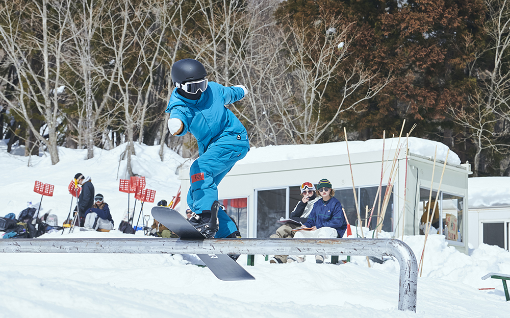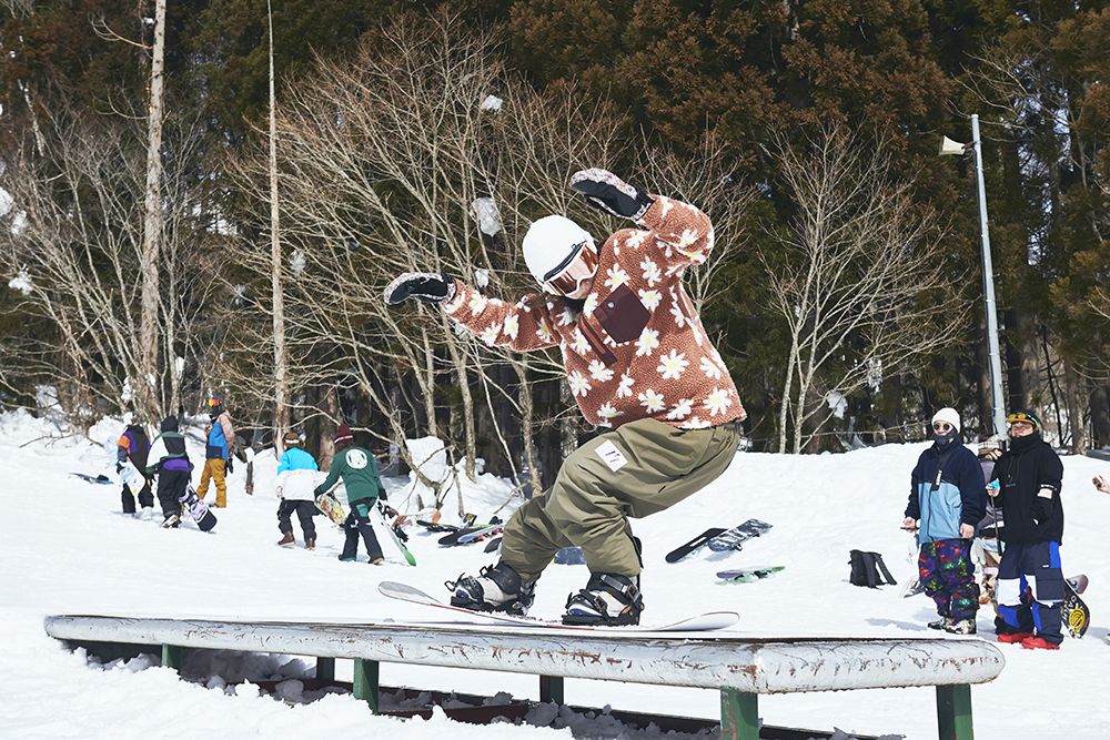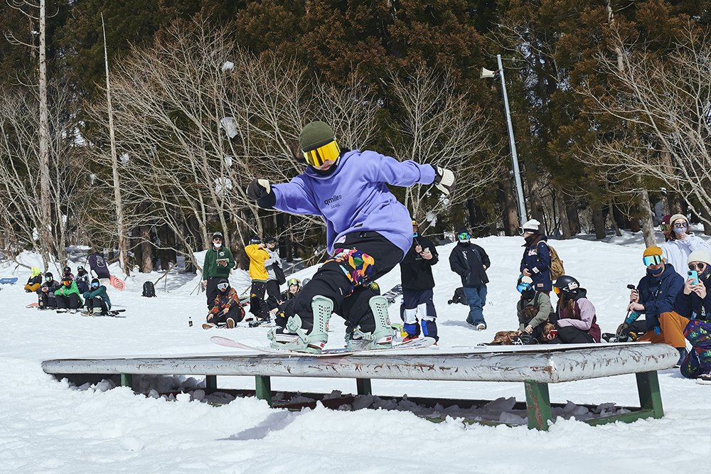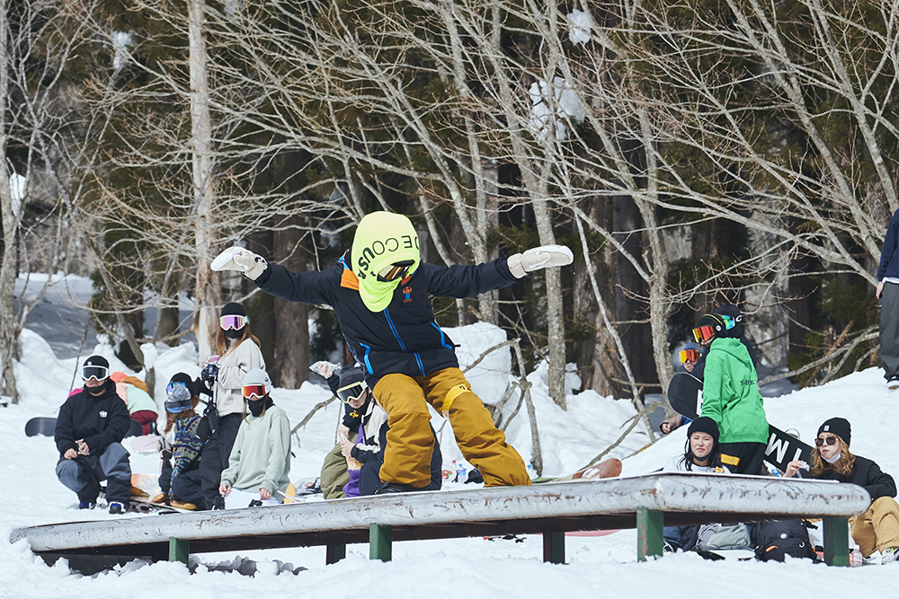 「先週から竜王に篭り始めて、この大奥は会場が住んでいるところと近かったので参加させていただきました。会社を辞めて、アラサーにして初篭りです(笑)。スノーボードはかれこれ5年くらいやっていて、ジブだけじゃなくて何でもやります。カービングもそこそこやりますし、パウダーも楽しいです。大会は、この前の岐阜県にあるダイナランドで開催されたスロープスタイルに出て、今回で2回目です。大奥は和気藹々としていたので、そこまで緊張感もなく滑れました。最初の時はめっちゃ緊張していたので、少しは慣れたのかな?」